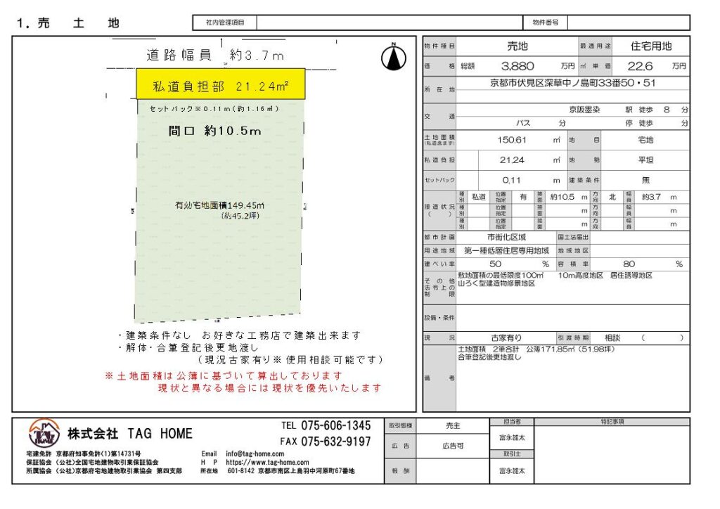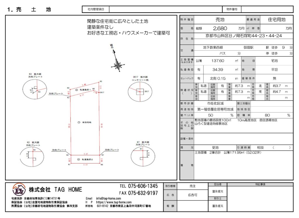 上記 深草中ノ島町30-50・51 2筆 売り土地 成約いたしました